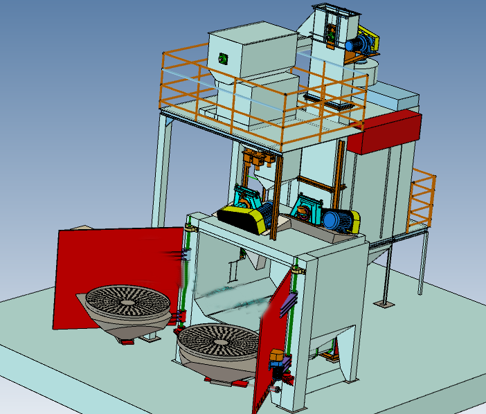 針對批量小的客戶可使用轉(zhuǎn)臺式拋丸機,使用工裝將彈簧固定在轉(zhuǎn)臺上,如圖: