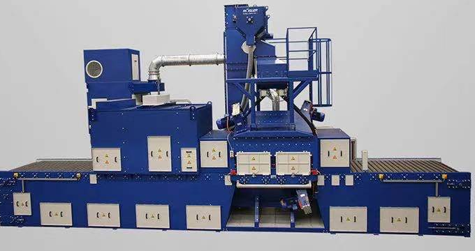 履帶式拋丸機工件在拋丸室里進行翻滾,拋丸室由環(huán)形的槽型皮帶以及兩頭由高耐磨材料制成的封頭組成,輸送皮帶上裝有導(dǎo)向條,從而保證了工件所有表面都暴露在外且翻轉(zhuǎn)時不會發(fā)生過度碰撞。工人在操作履帶式拋丸清理機時應(yīng)嚴格遵循實用程序: