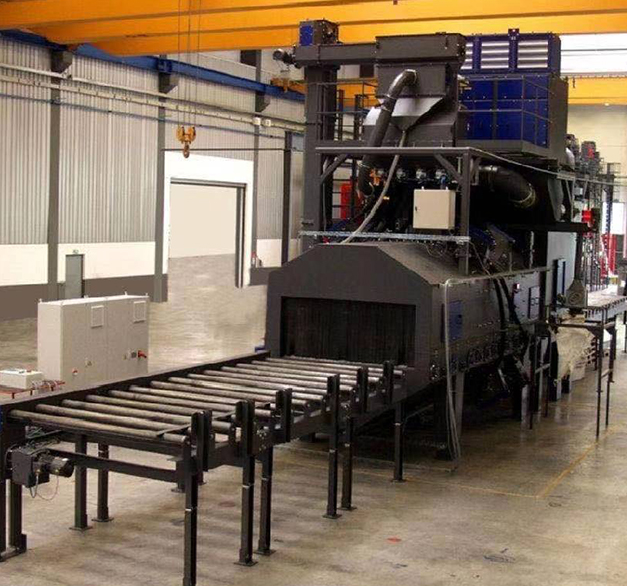 落入鋼材上面的彈丸與銹塵經(jīng)吹掃裝置吹掃,撒落下來的丸塵混合物由回收螺旋輸送到室體漏斗、縱橫向螺旋輸送機(jī)匯集于提升機(jī)下部再提升到機(jī)器上部的分離器里,分離后的純凈彈丸落入分離器料斗中內(nèi),供拋丸循環(huán)使用。通過式拋丸機(jī)拋丸清理中產(chǎn)生塵埃,由抽風(fēng)管送向除塵系統(tǒng),凈化處理后的凈氣排放到大氣中,顆粒狀塵埃被捕捉收集通過式拋丸機(jī)主要用于建筑、橋梁等行業(yè)用大型工字型鋼、等較高的鋼結(jié)構(gòu)件消除應(yīng)力及表面除銹清理。