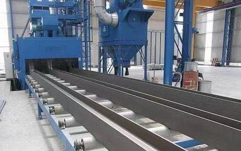 型鋼拋丸機用于大型工字型鋼、H型鋼尺寸較高的鋼結(jié)構(gòu)件消除應(yīng)力及表面除銹清理。輥道通過式拋丸機,清理過程中由電氣控制的可調(diào)速輸送輥道將鋼結(jié)構(gòu)件或鋼材送進清理機室體內(nèi)拋射區(qū),其周身各面受到來自不同坐標方位的強力密集彈丸打 擊與磨擦,使之其上的氧化皮、銹層及其污物迅速脫落,鋼材表面就獲得一定粗糙度的光潔表面,在清理室外兩邊進出口輥道裝卸工件。