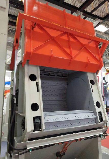 第五步:將履帶放入到清理室中,對于比較大的履帶可以使用室體頂部開眼,用鋼絲穿入懸吊的方式安裝,也可以在拋丸器葉輪位置固定一個手拉葫蘆來拉動履帶。