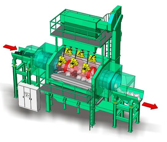 5.展帶式拋丸機完全停止后,打開加料門,將工裝及工件吊出。
