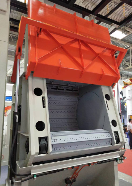 采用風(fēng)選式分離器,具有良好的分離效果和較高的生產(chǎn)率,減少了對(duì)耐磨件(如拋丸器葉片)的磨損;采用布袋式除塵器,粉塵排放濃度低于國(guó)家規(guī)定的標(biāo)準(zhǔn),改善了工人的勞動(dòng)環(huán)境;工件清理完畢后,履帶反轉(zhuǎn)即可實(shí)現(xiàn)自動(dòng)卸料。