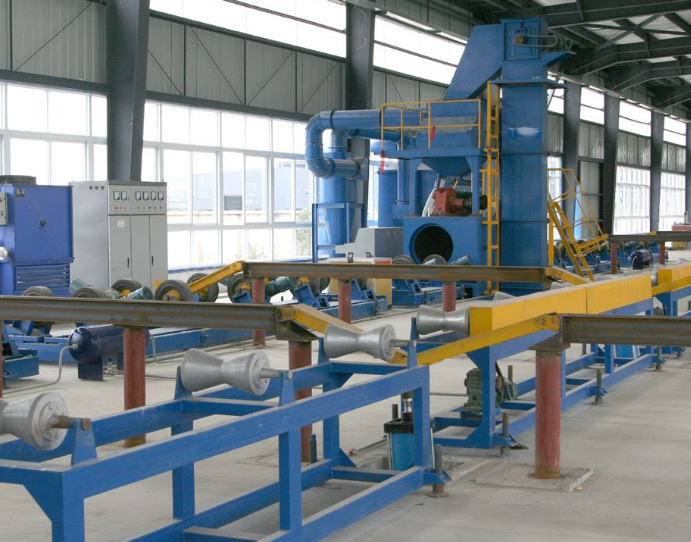 例如單根鋼管直徑1000mm,長度12000mm拋丸質(zhì)量達到Sa2.5級以上清理速度每分鐘達到6米以上。需要配備4臺拋丸器,功率為15KW,就可以達到要求,反之鋼管直徑小于1000mm的同時在保證拋丸質(zhì)量的前提下,速度可達到每分鐘6米以上。若大于鋼管直徑1000mm以上的,在保證拋丸質(zhì)量的前提下速度會每分鐘小于6米。