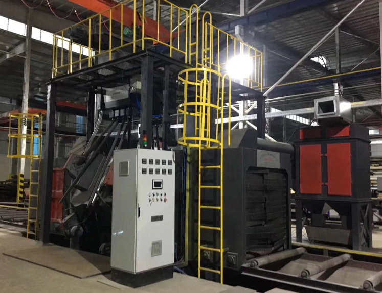 鋼板通過式拋丸機主要有輸送輥道、前后密封室、拋丸室、拋丸器總成、彈丸循環(huán)系統(tǒng)、彈丸清掃系統(tǒng)、除塵系統(tǒng)以及電控系統(tǒng)等組成。