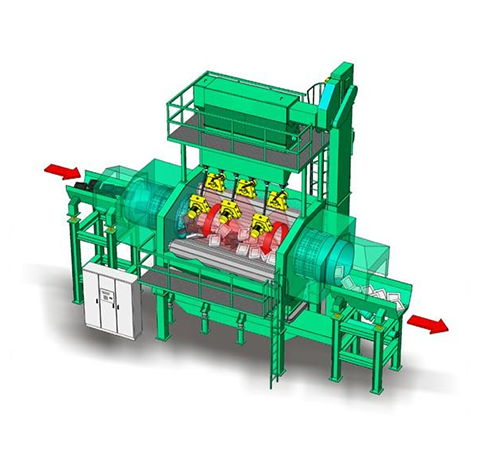 滾筒式拋丸機是適用于清理各種不怕碰撞、劃傷的鑄、鍛件,是小型熱處理車間清理工件表面殘砂、氧化皮的理想設(shè)備,主要有滾筒、分離器、拋丸器、提升機、減速電機等組成。滾筒式拋丸機主要是利用高速回轉(zhuǎn)的葉輪將彈丸拋向滾筒內(nèi)連續(xù)翻轉(zhuǎn)的工件上,從而達到清理工件的目的,屬于鑄造機械范圍。滾筒式拋丸機常見的傳動方式主要有三種: